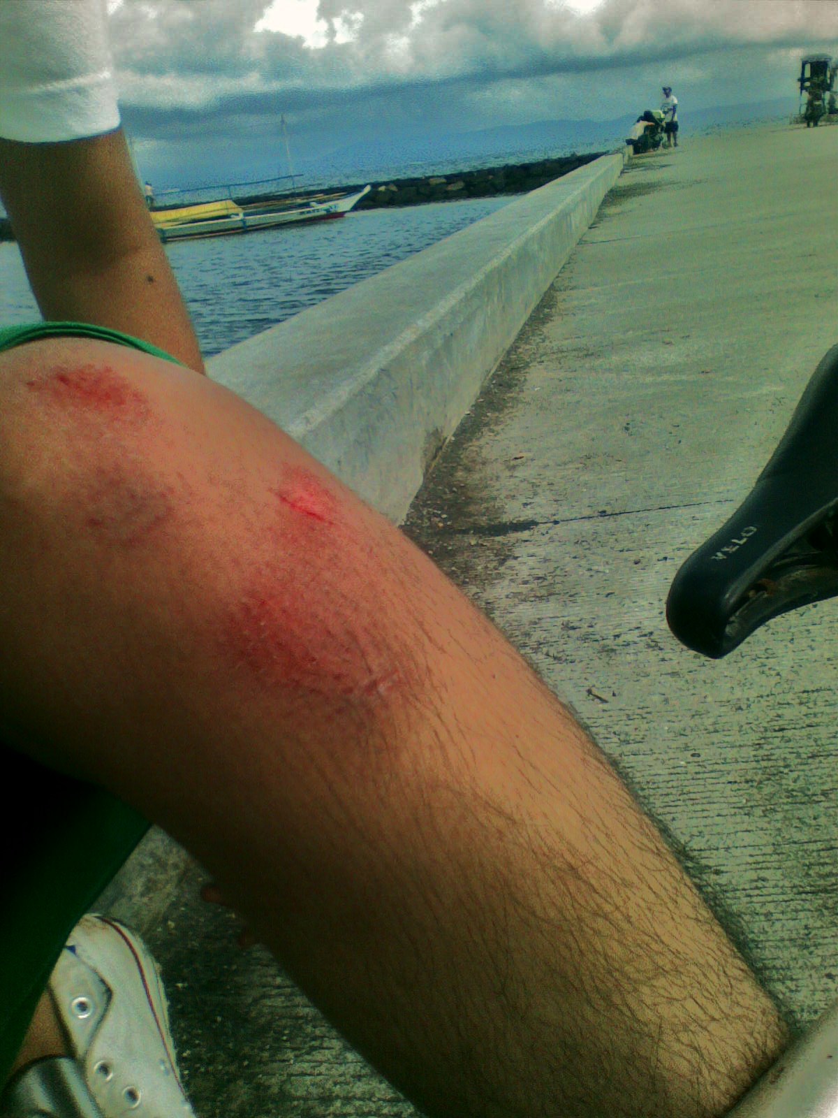Everything happened so fast. Next thing I knew, the toddler's father was helping me stand up after that catastrophic doom. I thanked him and decided to sit along the pavement. As I sat down and waited for my family members who were happily frolicking at a distance, my badly bruised left knee came into sight. Moments later, as the ocean breeze blew in, I started feeling the pain. Excruciating... Agonizing.... Unbearable pain! It was even more painful than the anti-acne facial treatment that I had the night before. Now, I can't walk straight nor run. I have to limp my way to every destination. Climbing several flights of stairs is torture. I have to be on guard or else something or someone might crash into the open wound. Also, wearing shorts is highly recommended since it prevents the abrasion from colliding with the fabric.